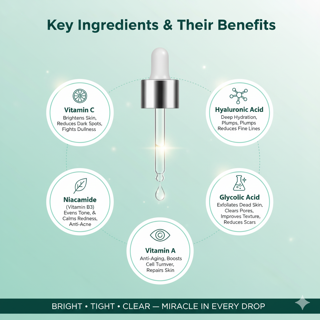 This powerful medicated whitening serum is a complete skin treatment designed to fight acne, scars, open pores, dullness, dark areas, and early aging signs. Enriched with Vitamin C, Vitamin A, Niacinamide (Vitamin B3), Hyaluronic Acid, and Glycolic Acid, it works deeply to brighten, tighten, hydrate, and repair your skin.