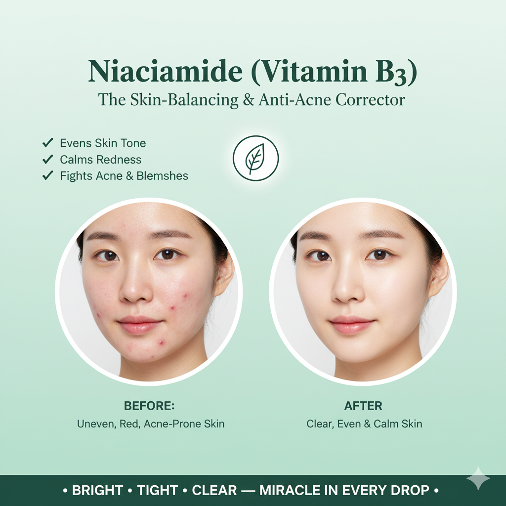 Niacinamide (Vitamin B3) – Controls oil, refines pores & evens tone