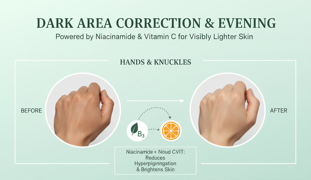 It is also highly effective on dark areas such as knuckles, elbows, toes, fingers, and neck lines, helping restore an even, fair, and radiant skin tone — safely and naturally.