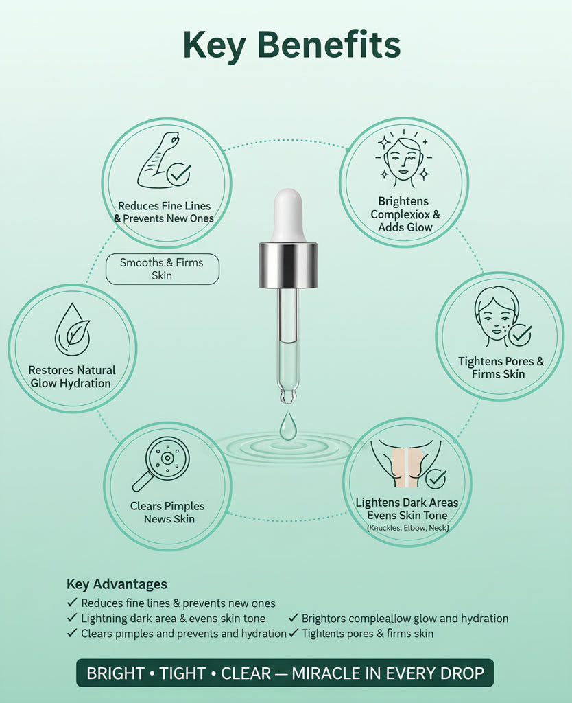 Apply 2–3 drops on clean skin (face, neck, elbows, or dark areas)